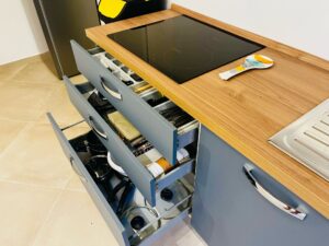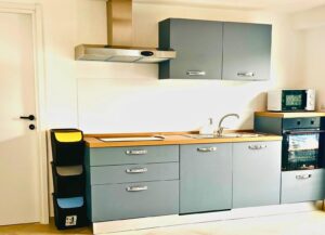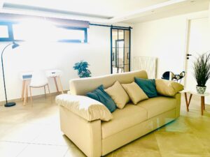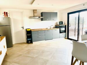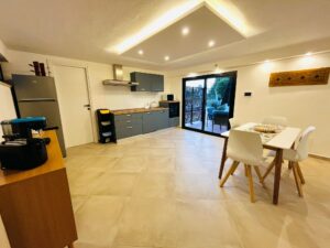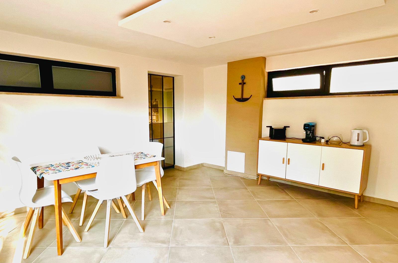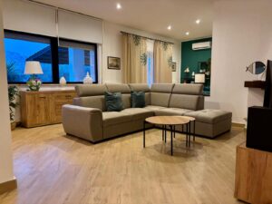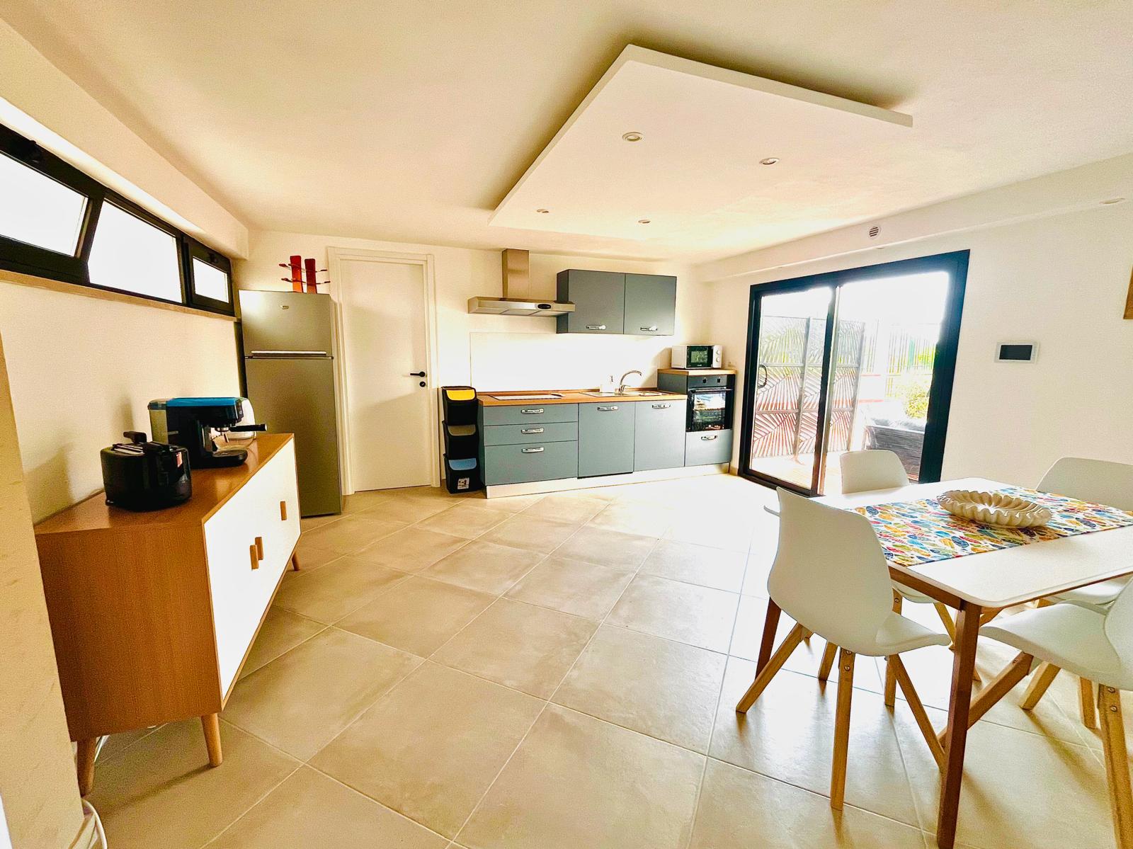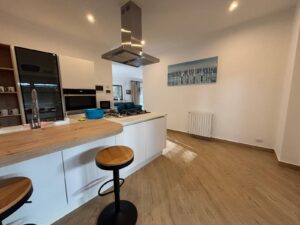 Cucina di generose dimensioni con isola centrale e dotata di tutti gli accessori, una grande zona living corredata da numerose superfici vetrate che conferiscono luminosità all’ambiente.